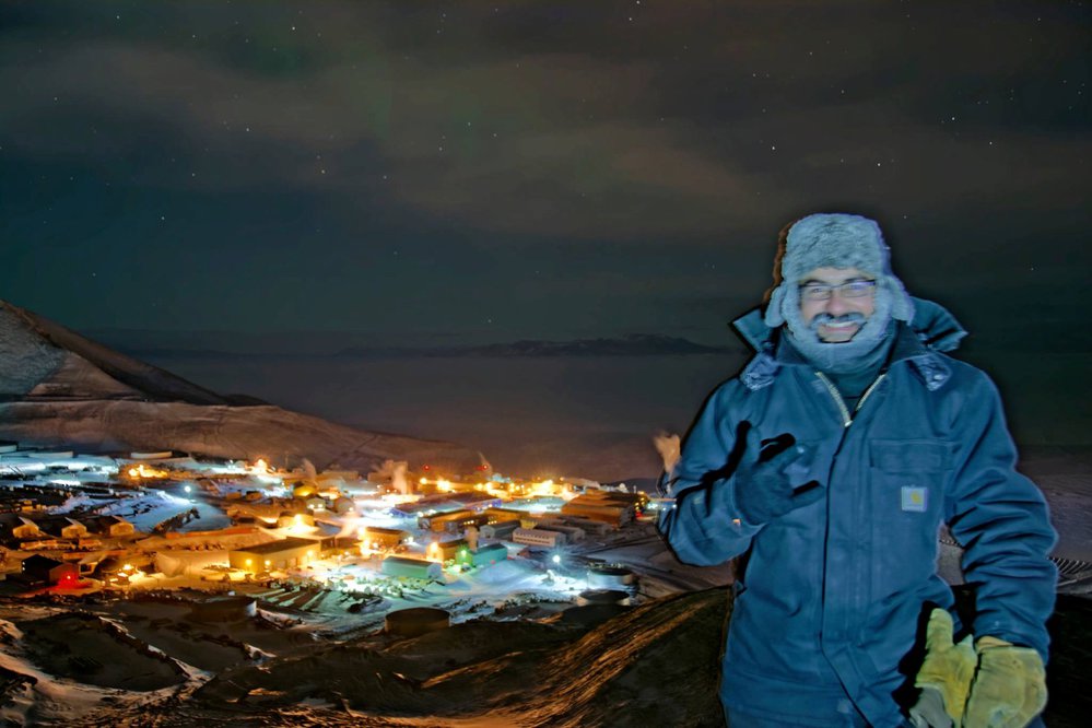 Chris Chen, LIDAR scientist at McMurdo station took this photo of Isaac Pio standing above McMurdo station with a mild aurora in the sky