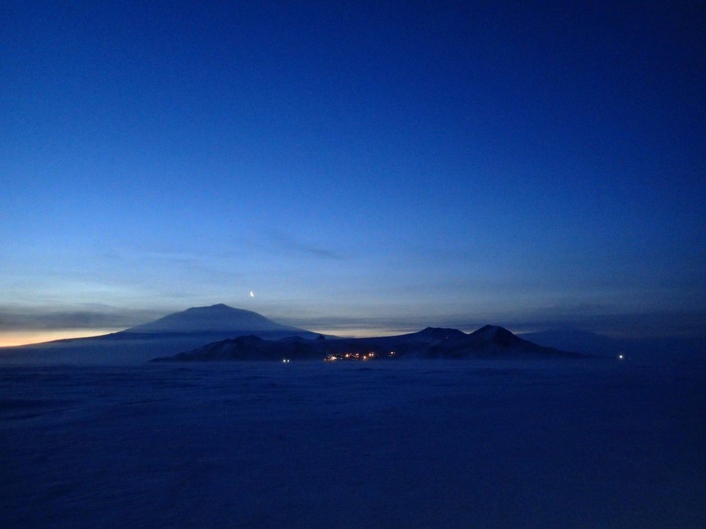 A view of Ross Island under a crescent moon as the sky slowly starts to lighten after winter's