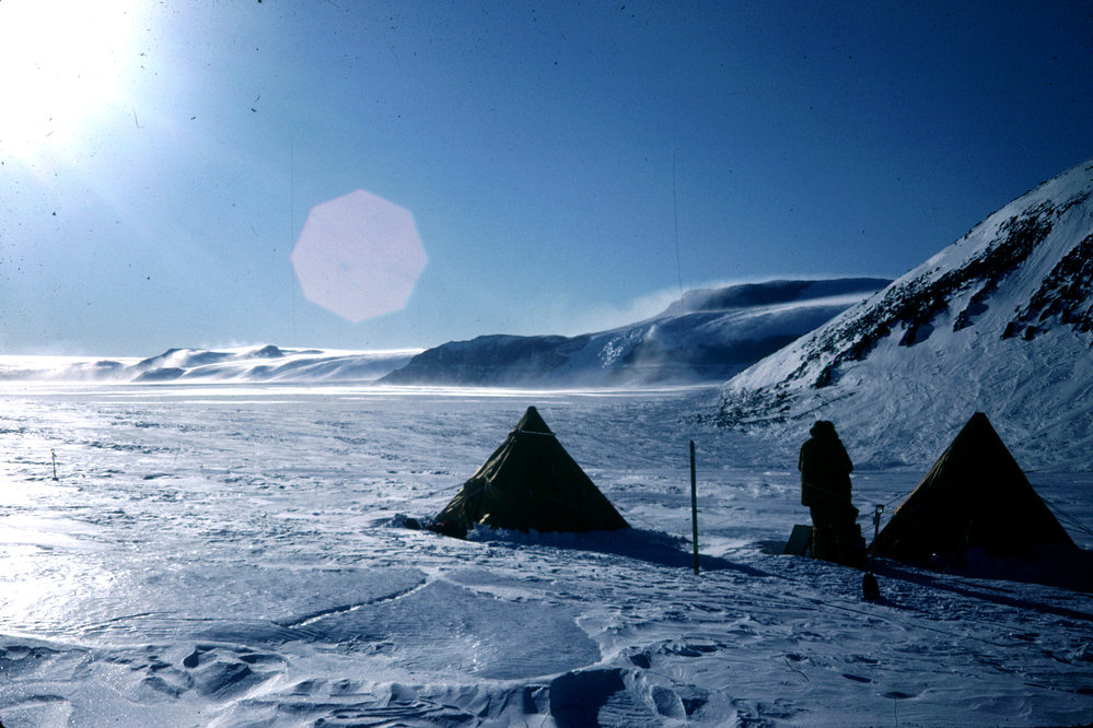 Tent camp on the east side of Portal Mountain, ( top of Skelton Glacier ), in late 1980's. Peter Cleary is outside of the tents in the photo
