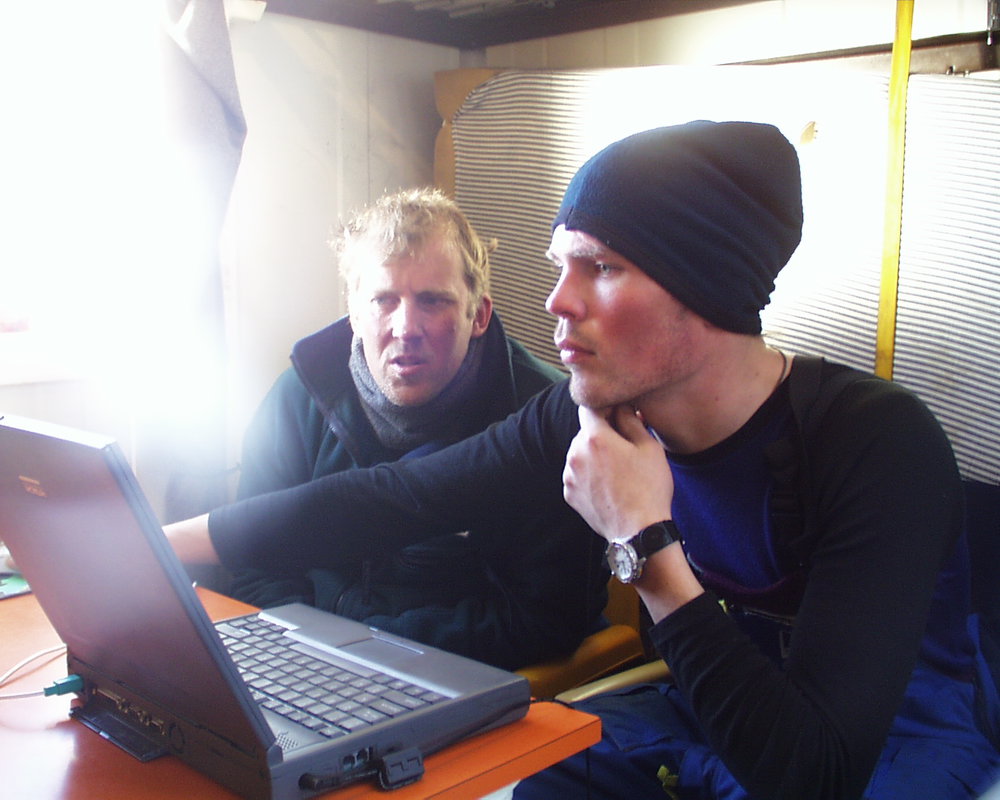Examining the hard-earned seismic data in the evening 10 kms west of Scott Base ; Stephen Bannister (left) and Huw Horgan (right)