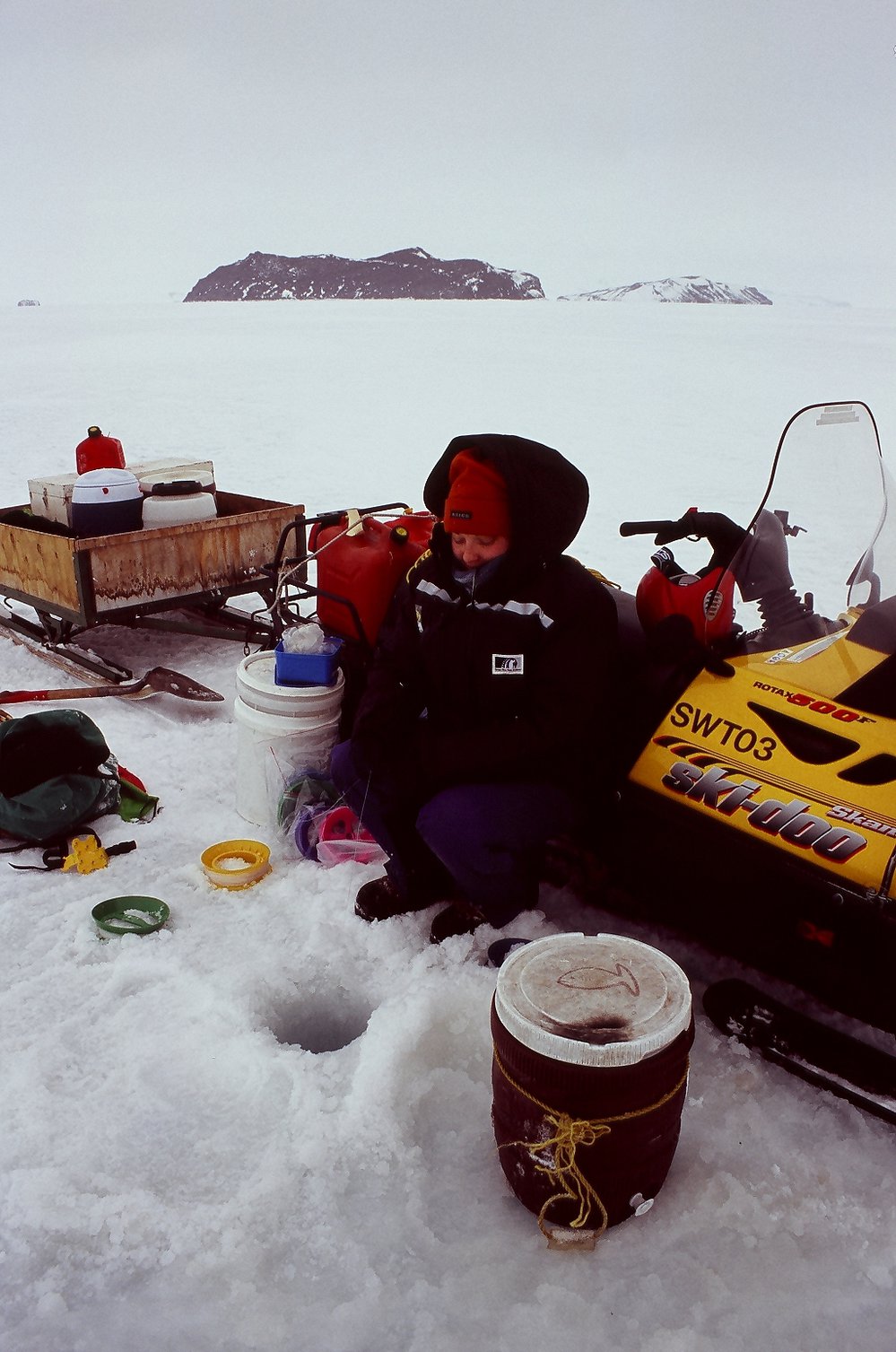 Esme Robinson fishing in the middle of nowhere off Cape Evans