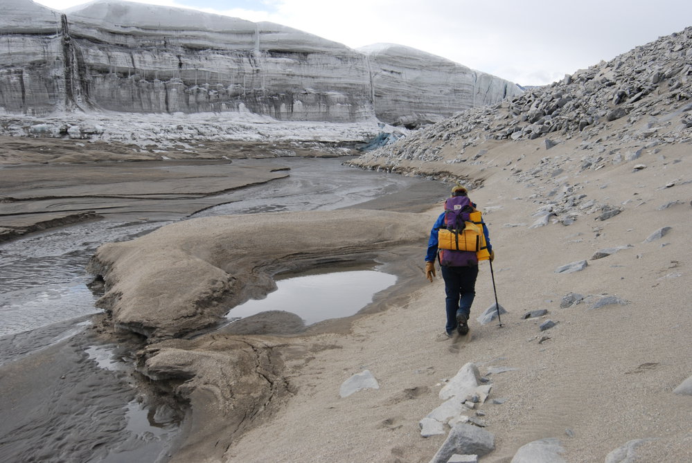 Scott Base AFT staffer Billy Wallace, walking near the face of the Adams Glacier, near Keyhole Lake. Antarctica NZ, accessed 02/04/2026, https://adam.antarcticanz.govt.nz/nodes/view/48696