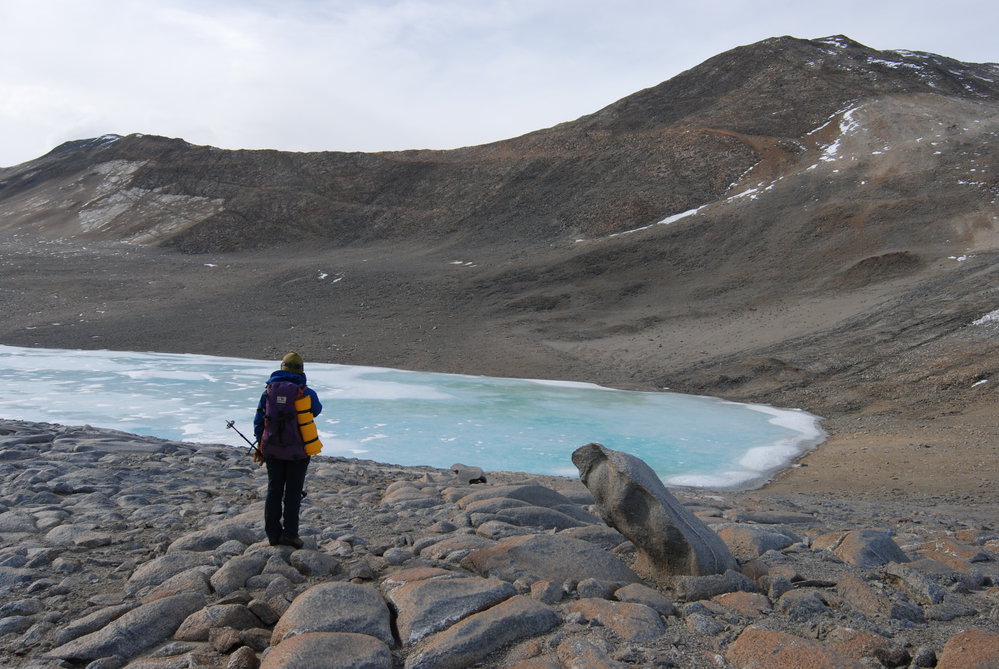 Pond on ridge north of campsite, with Scott Base AFT staffer Billy Wallace. Antarctica NZ, accessed 02/04/2026, https://adam.antarcticanz.govt.nz/nodes/view/48702