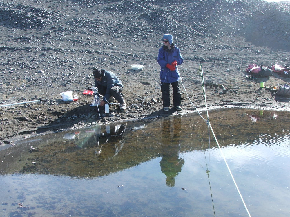 January 2008. Ian Hawes (left) and Brian Sorrell (right) use rope and pulley system to collect water from the centre of P70 Pond. Mats of cyanobacteria, the dominant life form of the system,