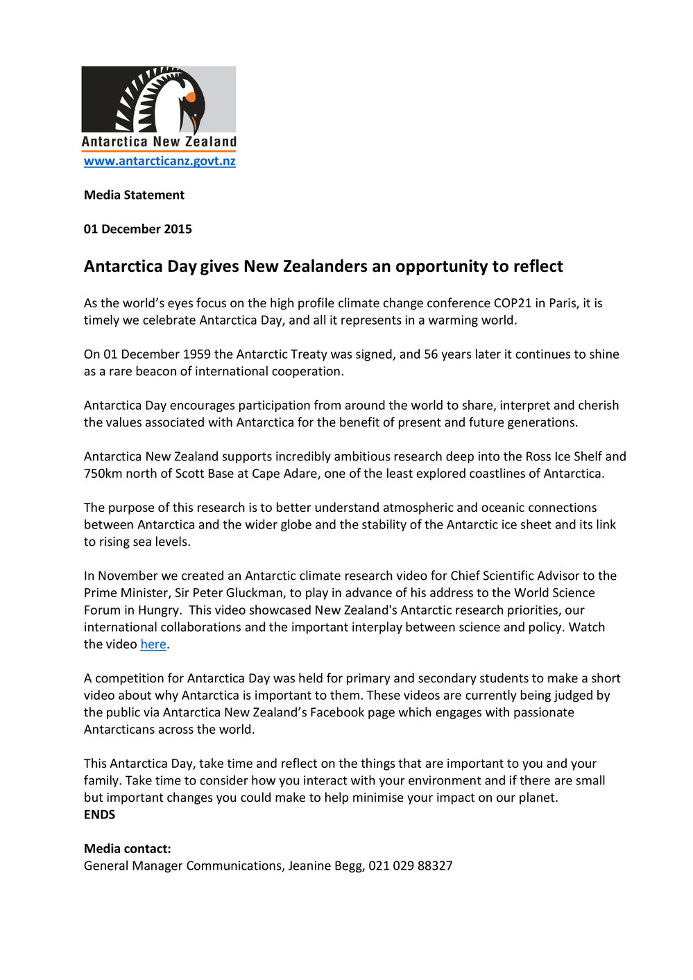 Jeanine Begg, PR - Antarctica Day gives New Zealanders an opportunity to reflect (2015-12-01). Antarctica NZ, accessed 26/03/2026, https://adam.antarcticanz.govt.nz/nodes/view/50294