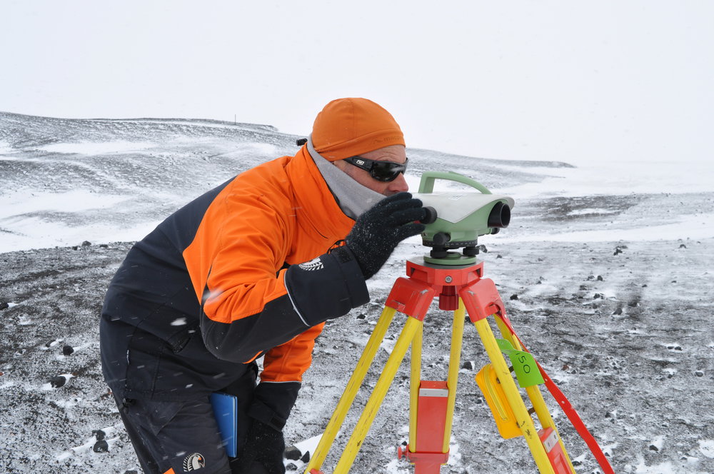 Matt Amos levelling in the snow