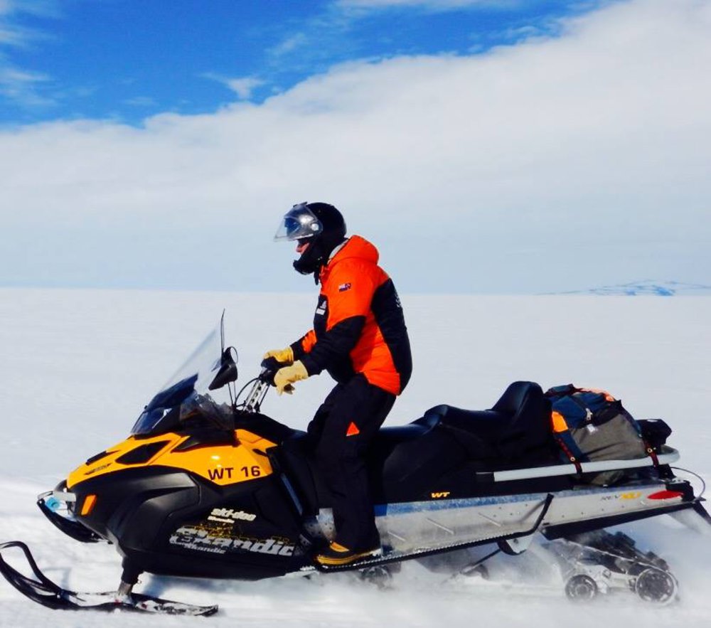 Tenby Powell on skidoo riding towards Mt Erebus