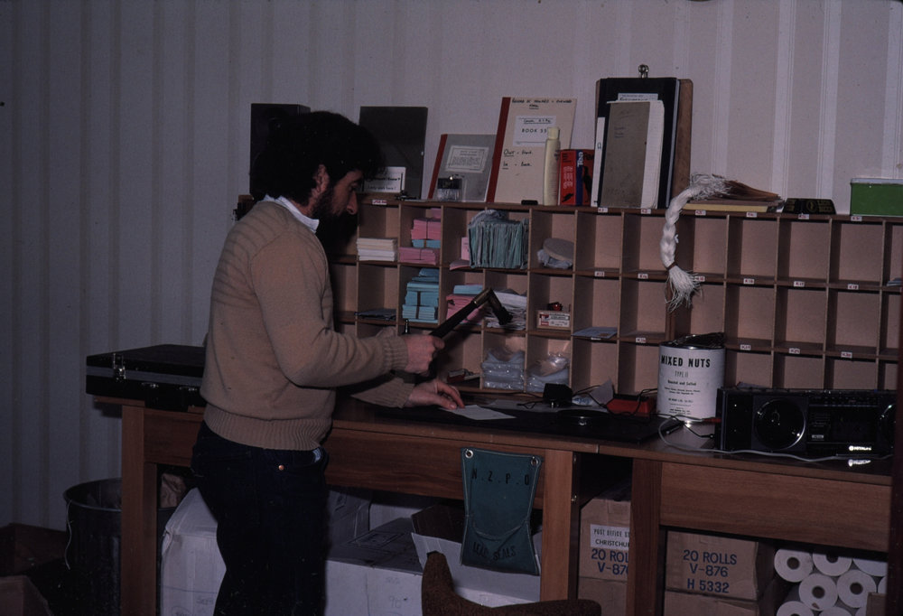 DescriptionPostal Clerk franking mail in new post officeDepictsBrent Reek PhotographerSue O'DowdSeason1983-1984Date Taken1983-1984 SeasonOriginalSlideNo. People1LocationScott BaseGeolocation[1] Position
