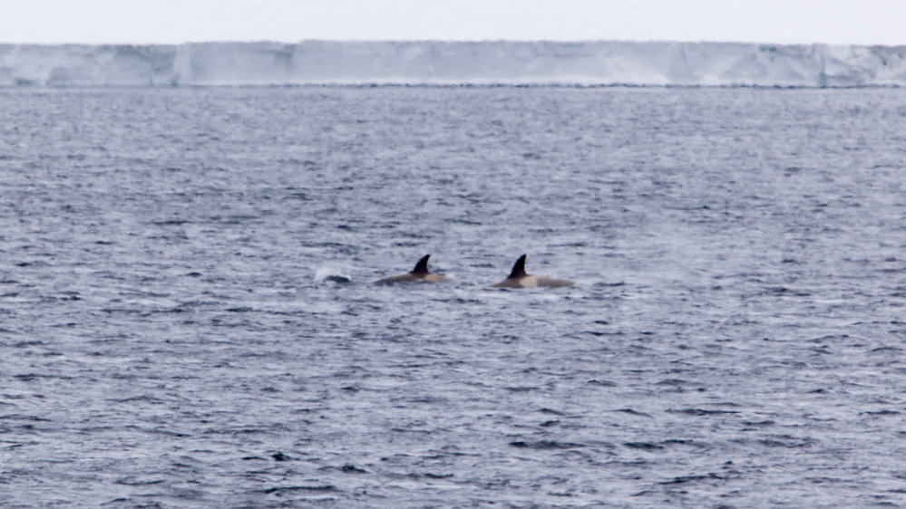 Orcas swimming in front of Scott Base
