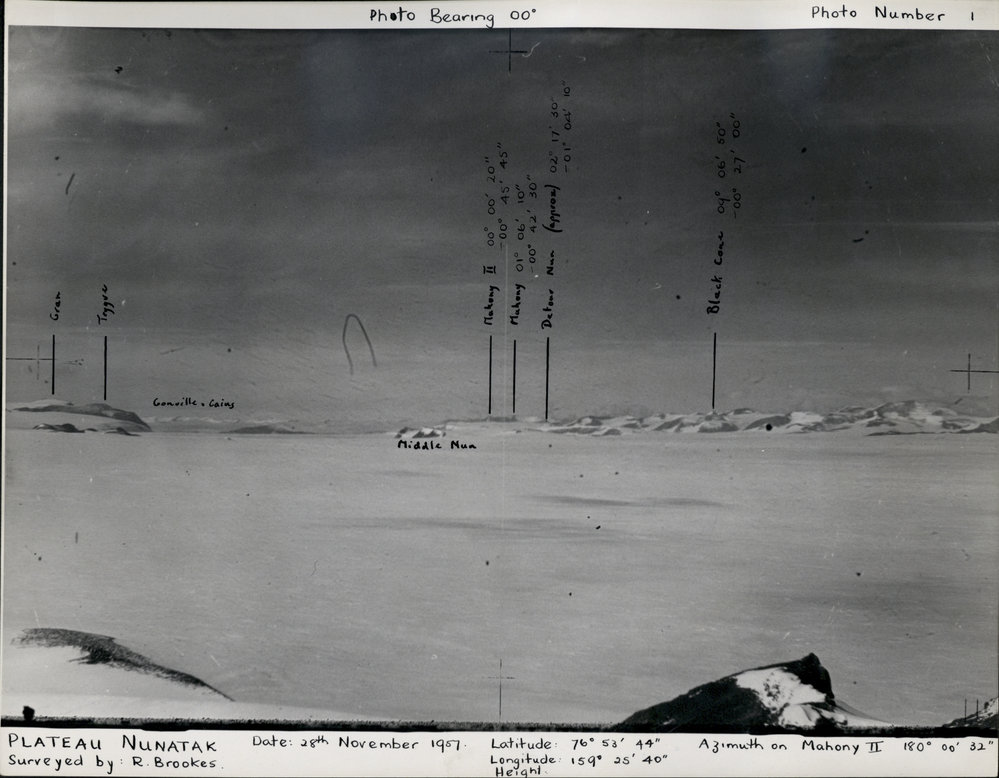 1 - Plateau Nunatak, Carapace Nunatak. Azimuth on Mahoney II 180 00' 32". Gran, Toygue, Gonville and Caius, Middle Nunatak, Mahoney II, Mahoney, Detour Nunatak (approx), Black Cone