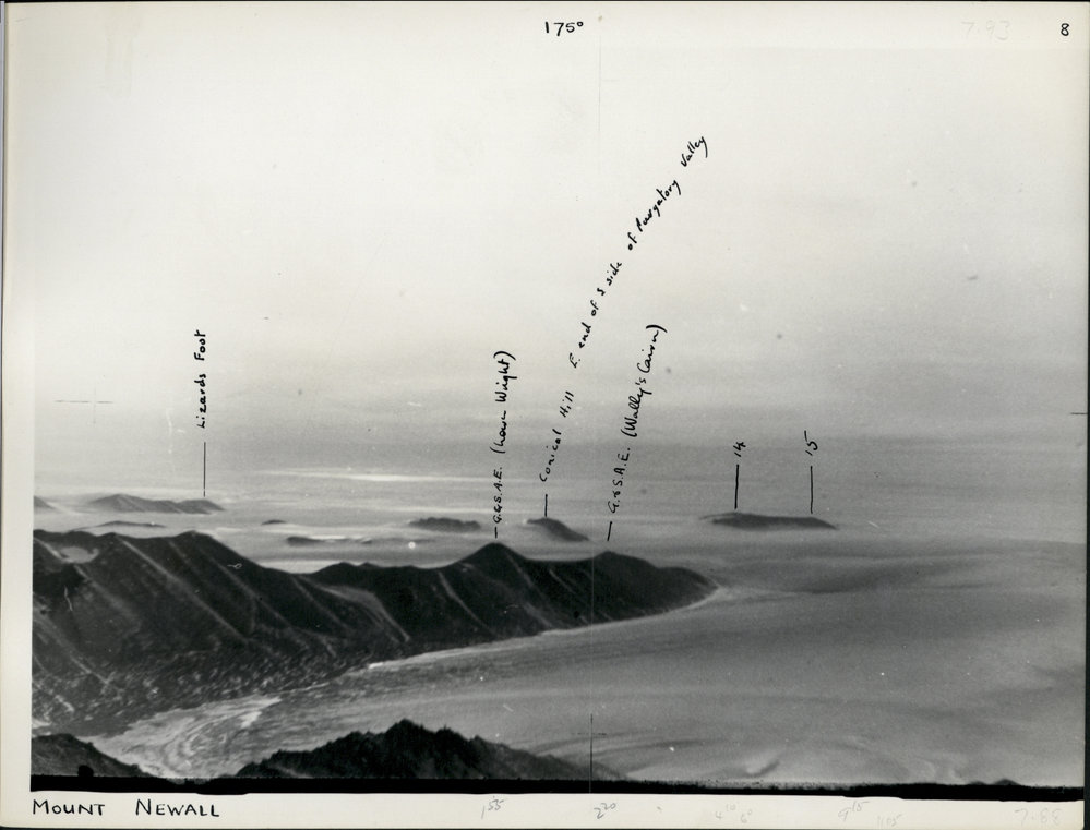 LocationMount NewallNotes on original8 - From Mt Newall, Round Zeroed on Knobhead. Lizard's Foot, G&SAE (Lower Wright), Conical Hill east end of south side of Purgatory Valley, G&SAE(Wally's Cairn) - comps book 2LINZ ReferenceD10 - 175 degreesHeight6840' by Aneroid