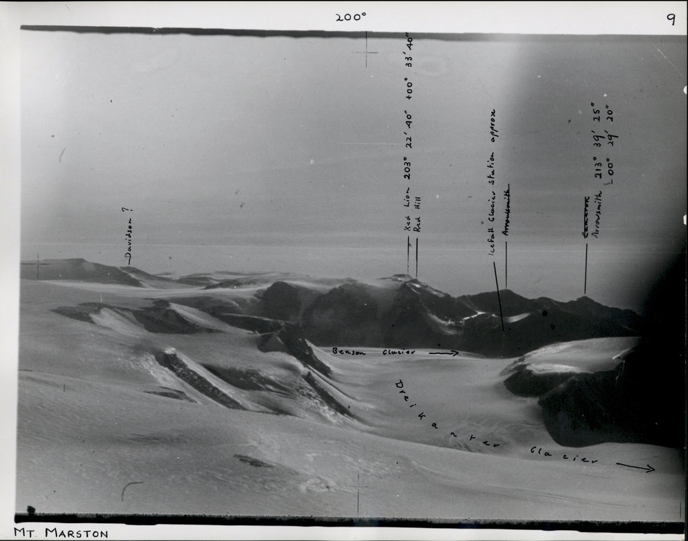 LocationMount MarstonNotes on original9 - From Marston, England. Azimuth on Mt England: 180 03' 26.5". Davidson?, Red Lion, Red Hill, Icefall Glacier Station approx, Arrowsmith, Driekanter Glacier, Benson GlacierLINZ ReferenceE21A - 200 degreesLatitude76 52'43"Height4450' by aneroid