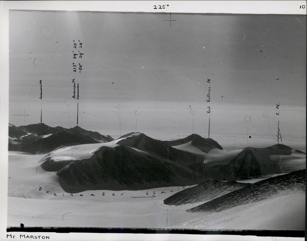LocationMount MarstonNotes on original10 - From Marston, England. Azimuth on Mt England: 180 03' 26.5". Arrowsmith, Red Buttress Pk, E PkLINZ ReferenceE22A - 225 degreesLatitude76 52'43"Height4450' by aneroid