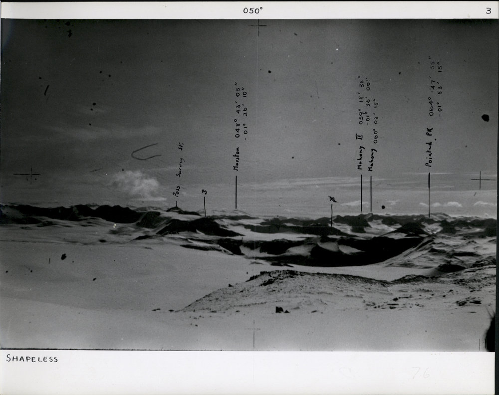 LocationShapelessNotes on original3 - From Shapeless. Origin Tent Pk. Possible survey station, Marston, Mahoney II, Mahoney, Pointed Pk - compas book p 76LINZ ReferenceG33-33A - 050 degreesLatitude77 25' 00"Longitude160 20'00"
