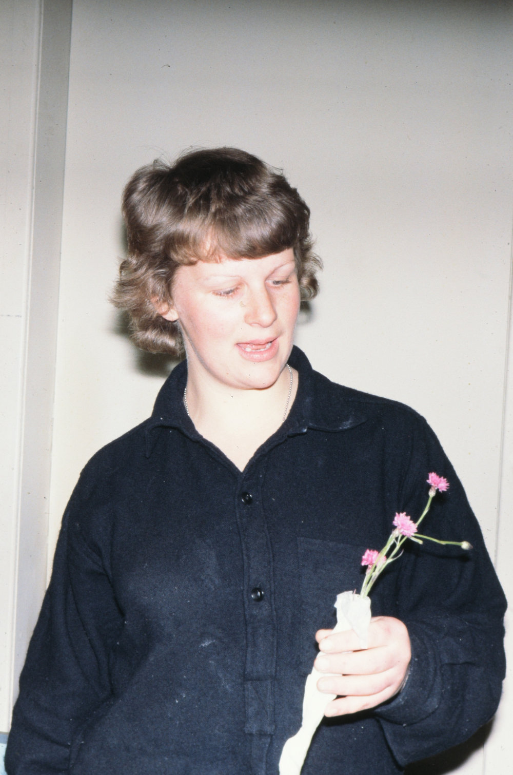 DescriptionAssistant Cook with flowers from L. Fryxell glasshouseDepictsLeigh Huggeridge PhotographerNigel S RobertsSeason1979-1980Date Taken1979-1980 SeasonOriginalSlideNo. People1LocationScott BaseGeolocation[1] Position