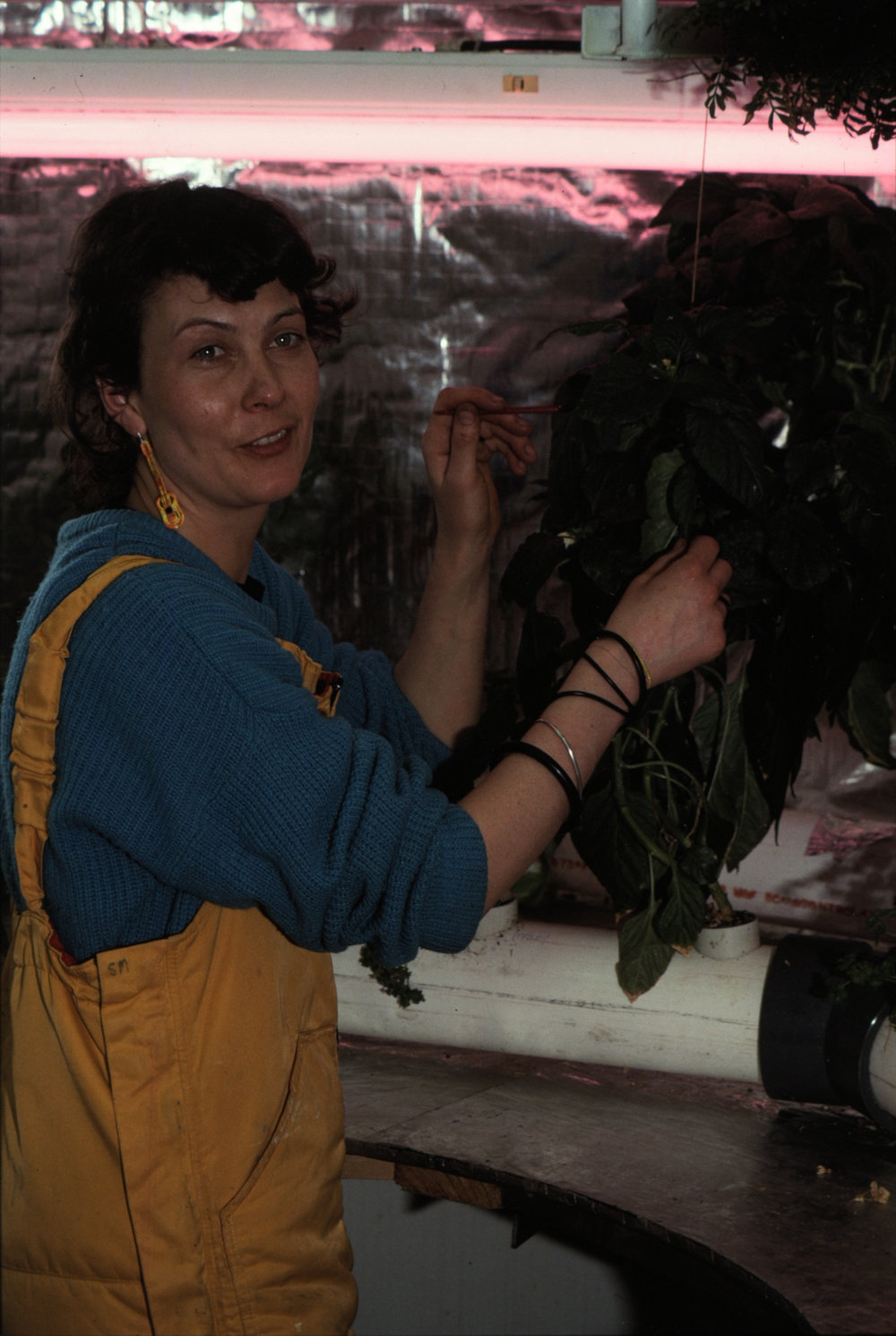 DescriptionStaff member at base tending hydroponic plantDepictsTuppence Loe PhotographerCath GilmourSeason1990-1991Date Taken1990-1991 SeasonOriginalSlideNo. People1LocationScott BaseGeolocation[1] Position