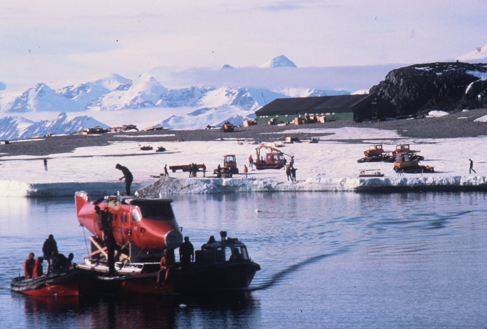 Descriptionaircraft fuselage ferried using 3 small boats, shoreline and equipment in backgroundPhotographerDavid Wynn-WilliamsSeason1980-1981Date Taken1980-1981 SeasonOriginalSlideNo. People>10LocationRothera