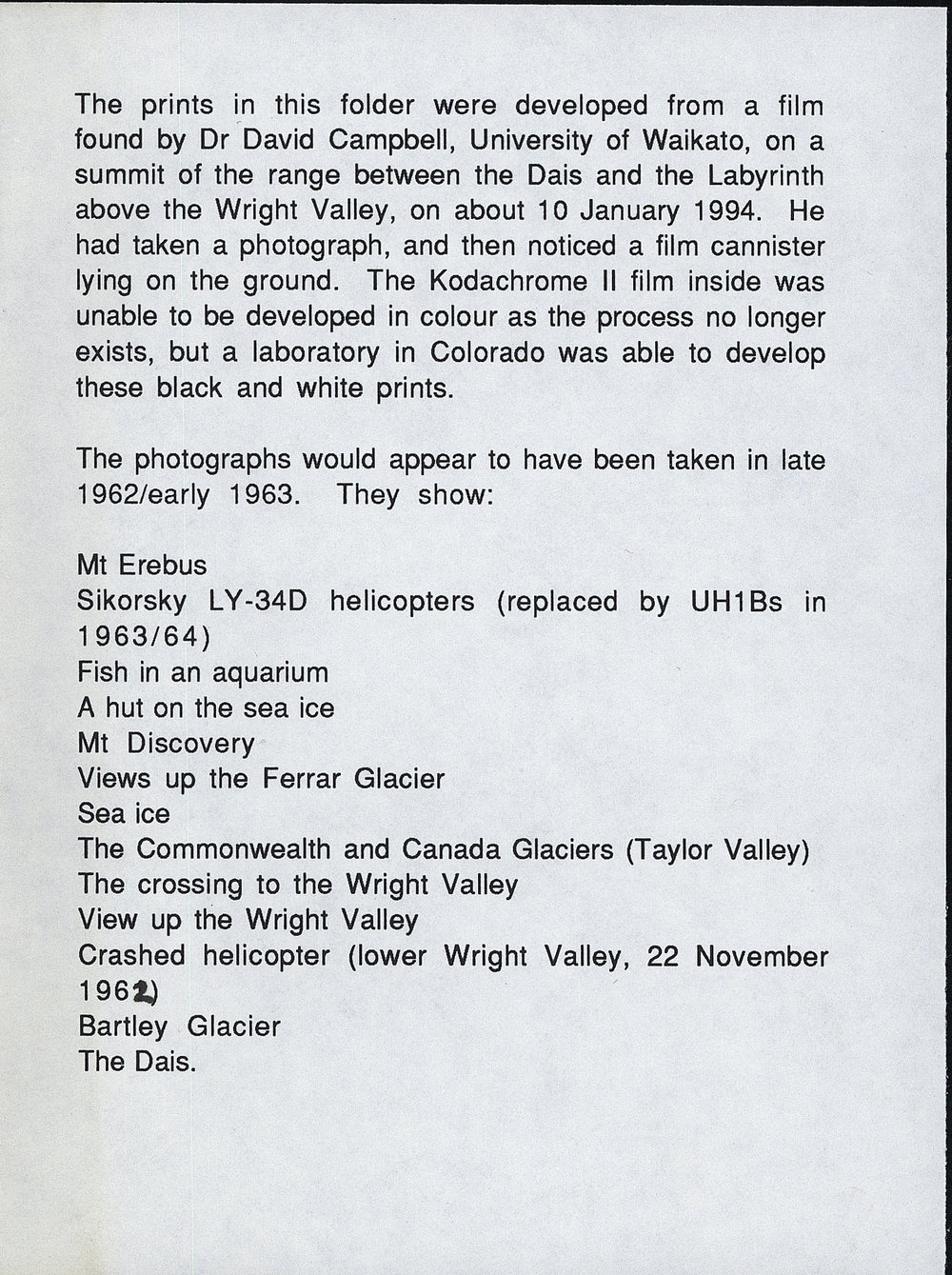 Album of lost photos found on a summit in the Dry Valleys in 1994. Antarctica NZ, accessed 13/04/2026, https://adam.antarcticanz.govt.nz/nodes/view/60299