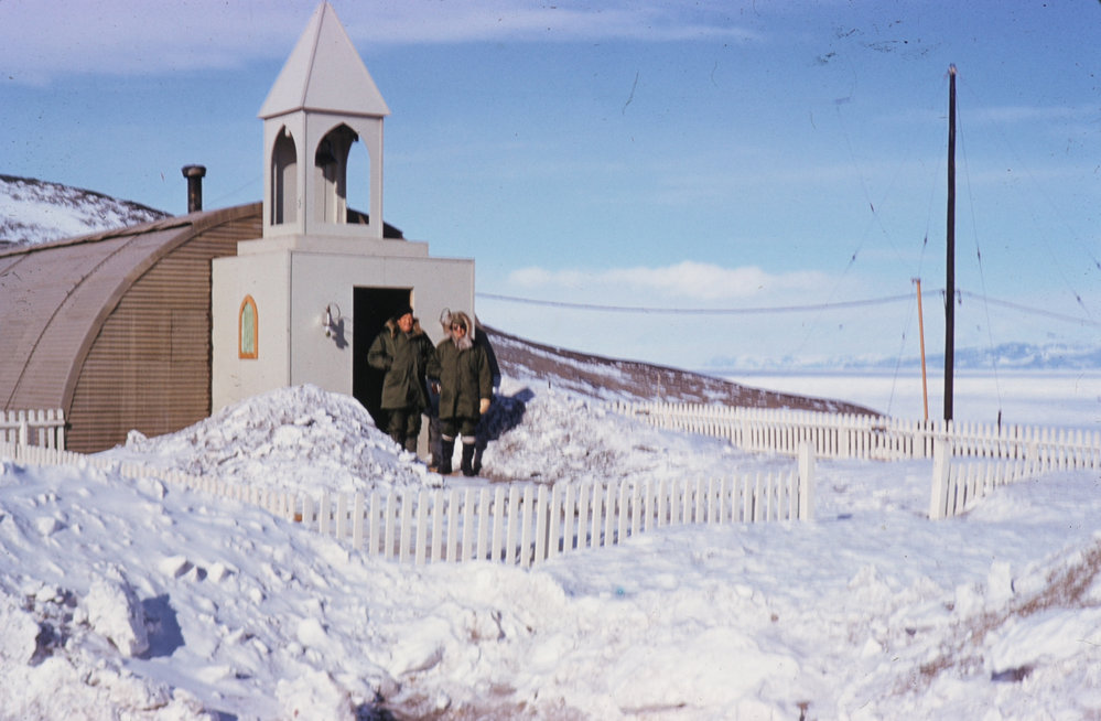 Descriptiontwo people standing at front door of chapel in deep snow and sunshinePhotographerJ W BeagleySeason1956-1957Date Taken1956-1957 SeasonOriginalSlideNo. People2-5LocationMcMurdo StationGeolocation[1] Position