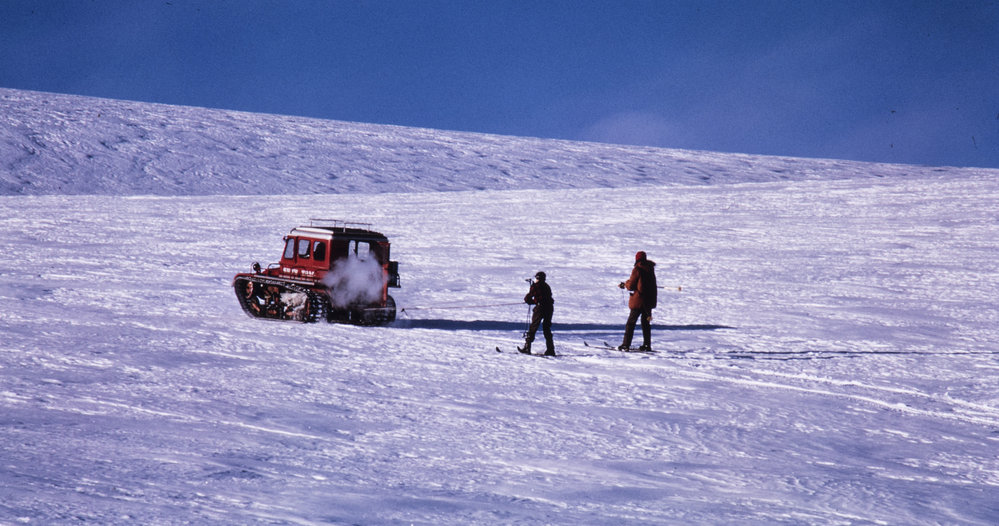 Jeremy & Jonathan Porritt skiing behind Snow Tractor