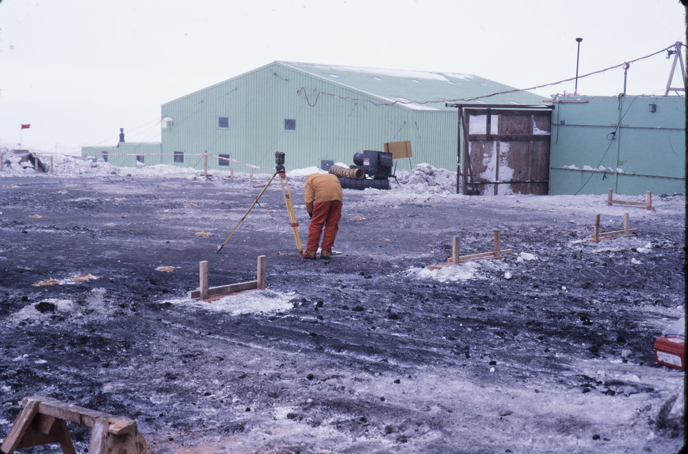 DescriptionPhil Winters surveying Stage VI construction siteDepictsPhil WintersPhotographerLinda HarrisonSeason1985-1986Date Taken1985-1986 SeasonOriginalSlideNo. People1LocationScott Base