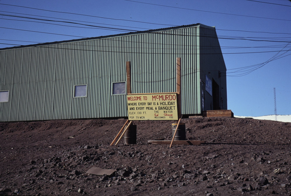 Descriptionexterior view of general stores building with welcome signPhotographerElizabeth BulleidSeason1980-1981Date Taken1980-1981 SeasonOriginalSlideLocationMcMurdo StationGeolocation[1] Position