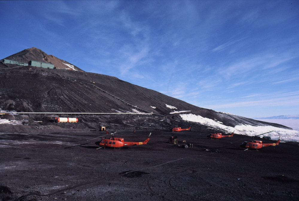 helicopters on pad at McMurdo Station with Observation Hill in background