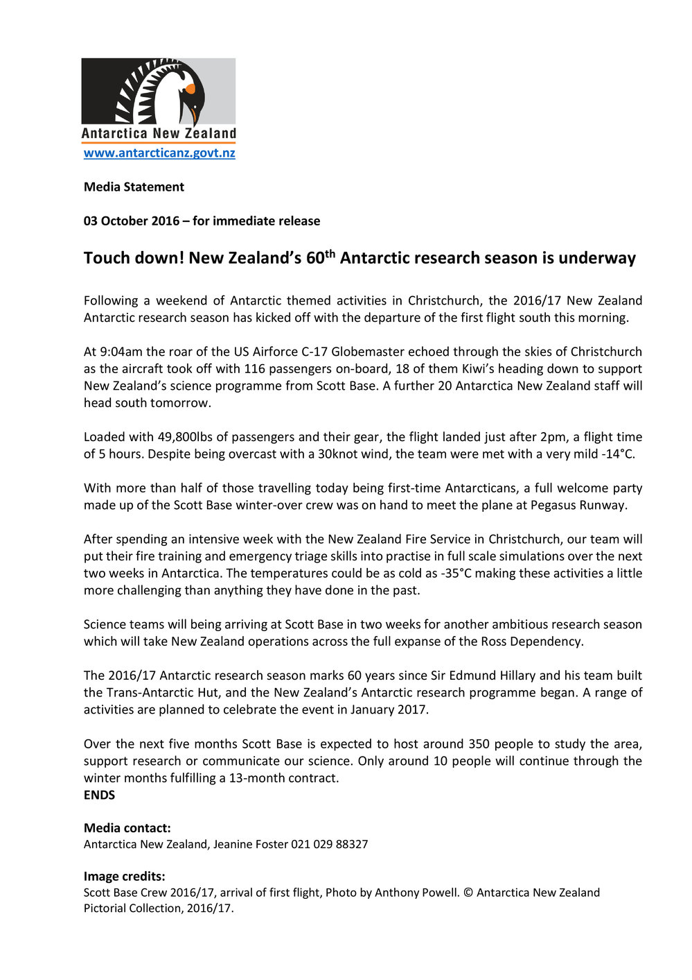 Jeanine Foster, PR - Touch down! New Zealand’s 60th Antarctic research season is underway (2016-10-03). Antarctica NZ, accessed 26/03/2026, https://adam.antarcticanz.govt.nz/nodes/view/61689