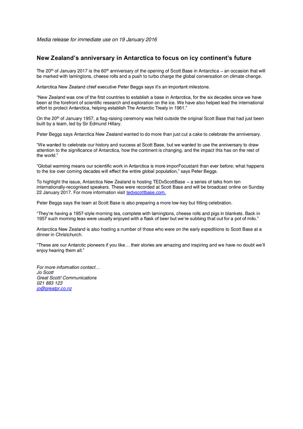 PR New Zealand’s anniversary in Antarctica to focus on icy continent’s future (2017-01-20). Antarctica NZ, accessed 25/04/2026, https://adam.antarcticanz.govt.nz/nodes/view/62236