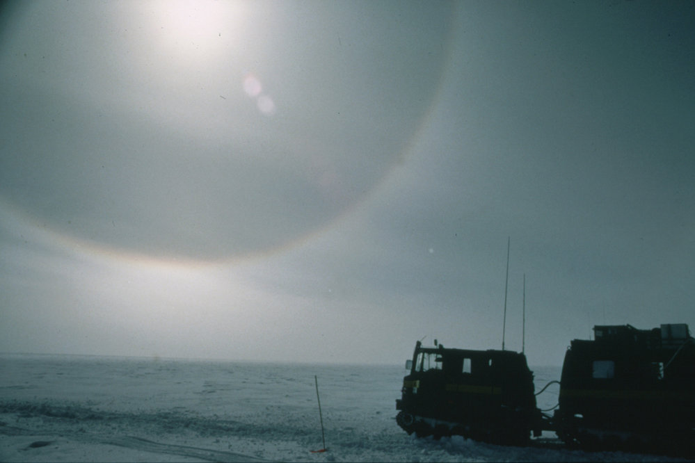 Halos in the sky - with NZAP Hagglunds in the foreground - on the Polar Plateau, during the 1993-1994 EAST93 geophysical traverse