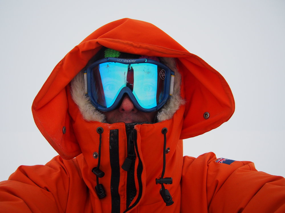 ECW Jacket and goggles in use during stormy weather at AFT camp - Windless Bight