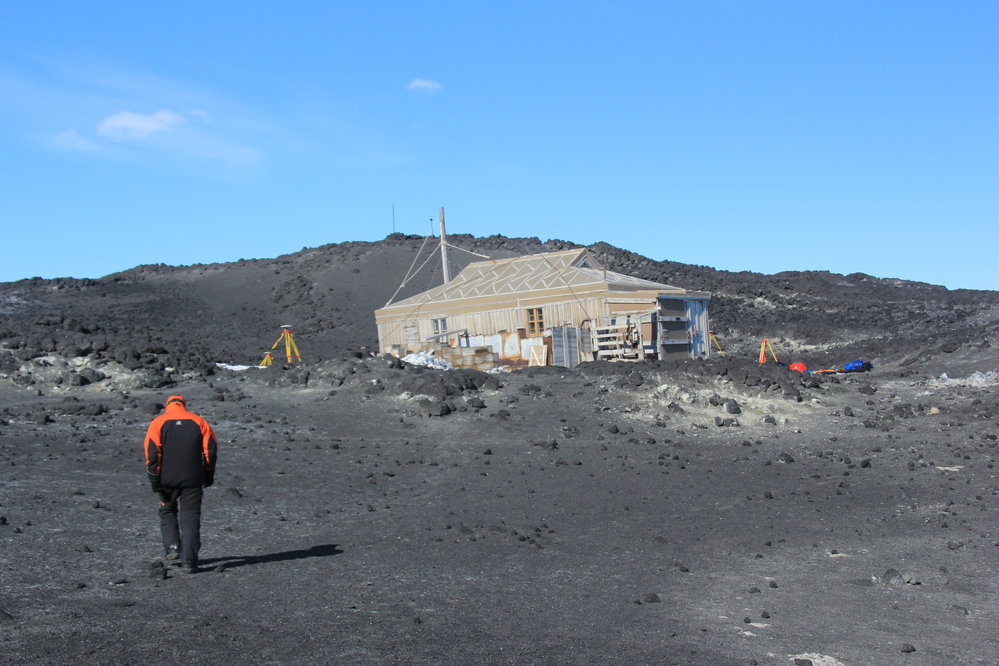 Andrew Cowie walking towards Shackeltons Hut Cape Royds with GPS receivers on monitoring survey marks 8/12/16