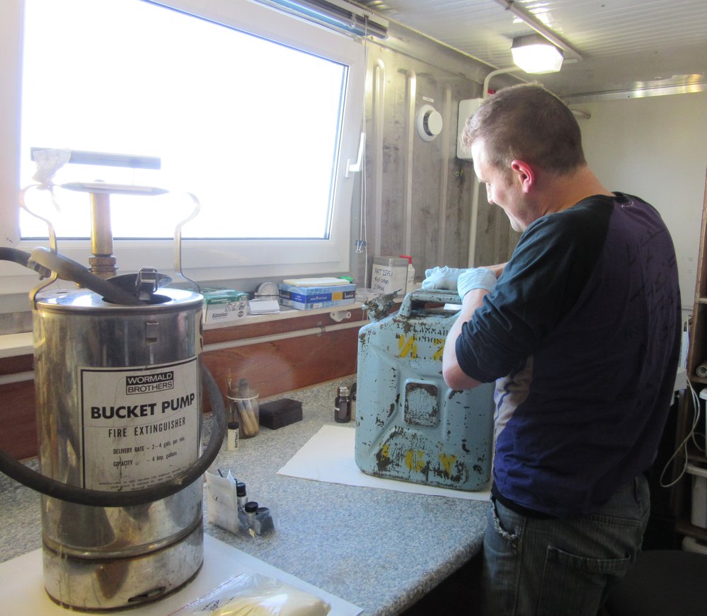 Antarctic Heritage Trust Conservator Ciaran Lavelle, works in the summer conservation laboratory (next to the Hangar at Scott Base). On the bench, a fuel jerry can and a fire extinguisher.