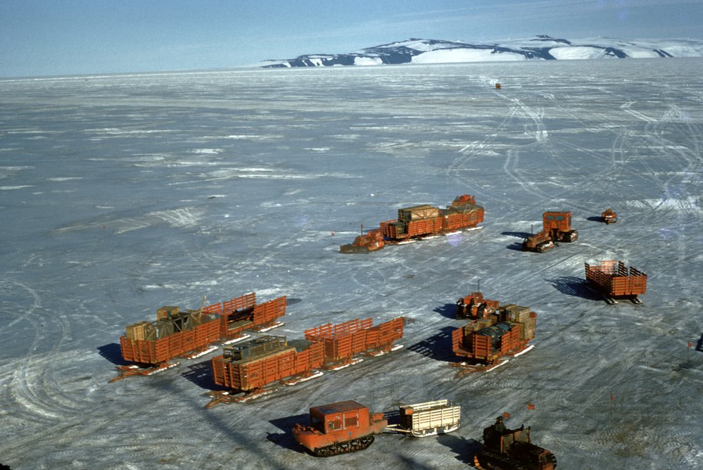A group of loaded and unloaded TAE-era sleds parked up on the sea-ice in front of Scott Base