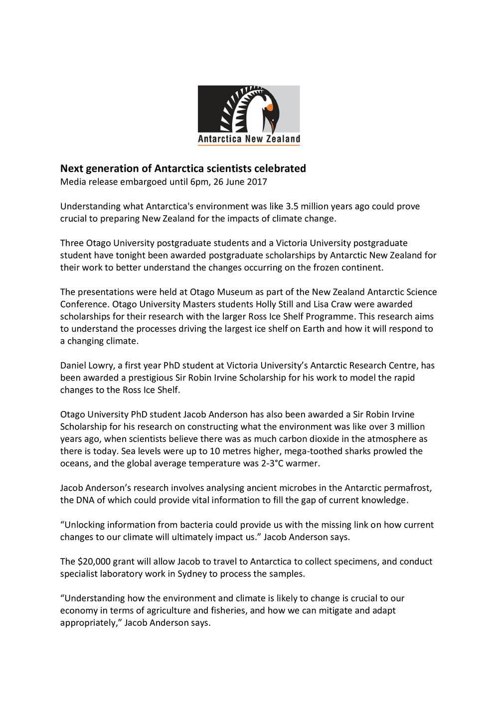 Alex McKay, PR - Next generation of Antarctica scientists celebrated (2017-06-26). Antarctica NZ, accessed 14/04/2026, https://adam.antarcticanz.govt.nz/nodes/view/63135