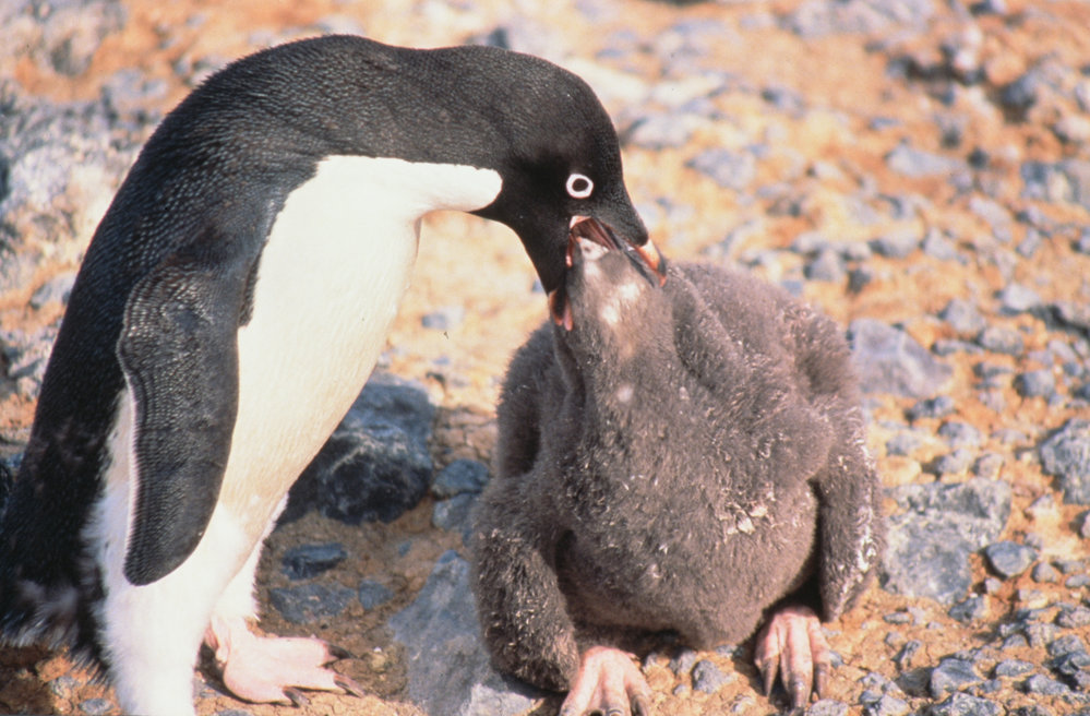 Adelie Penguin parent feeding chick