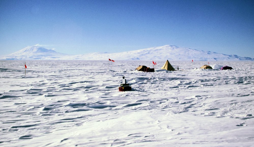 Air-sampling camp on Ross Ice Shelf, Mts Erebus and Terror beyond. Antarctica NZ, accessed 05/04/2026, https://adam.antarcticanz.govt.nz/nodes/view/65395