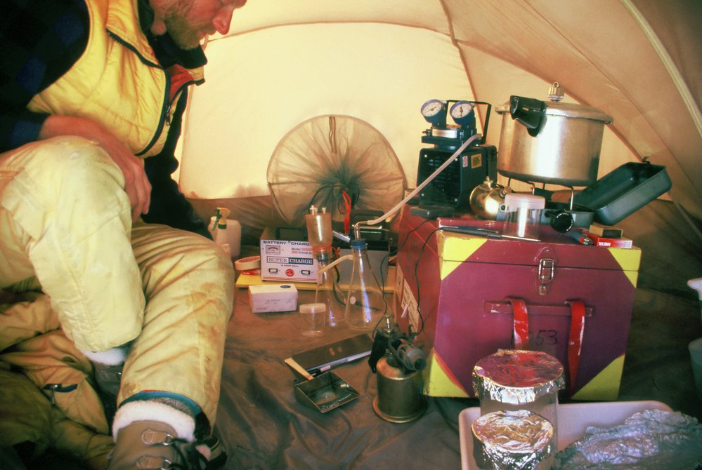 PAB in tent filtering snow melt for detection of microbes