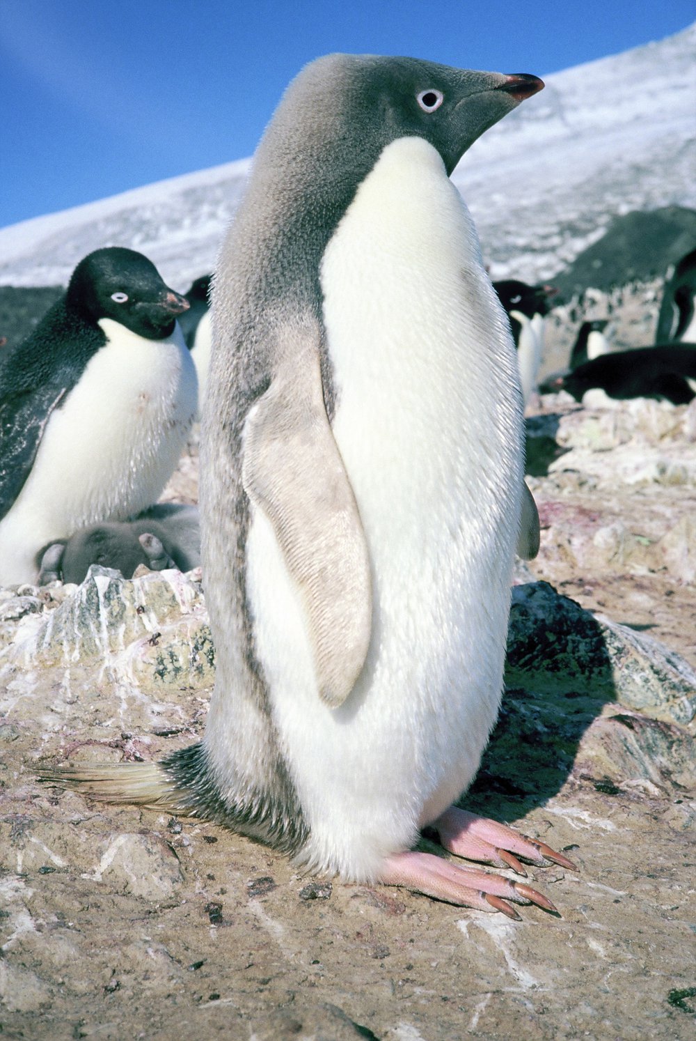 Silvery feathers of partial albino Adelie, at Northern Rookery