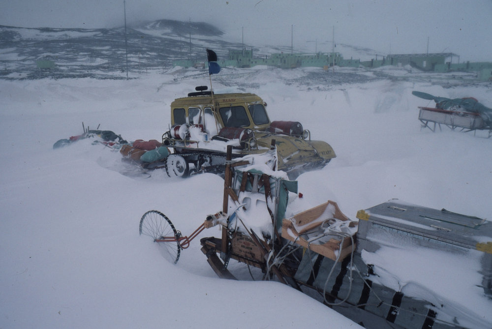 DescriptionSnow-trac K7 & sled K26 in snowdrift, Scott BasePhotographerKim WesterskovSeason1982-1983Date Taken1982-1983 SeasonOriginalSlideLocationScott BaseGeolocation[1] Position