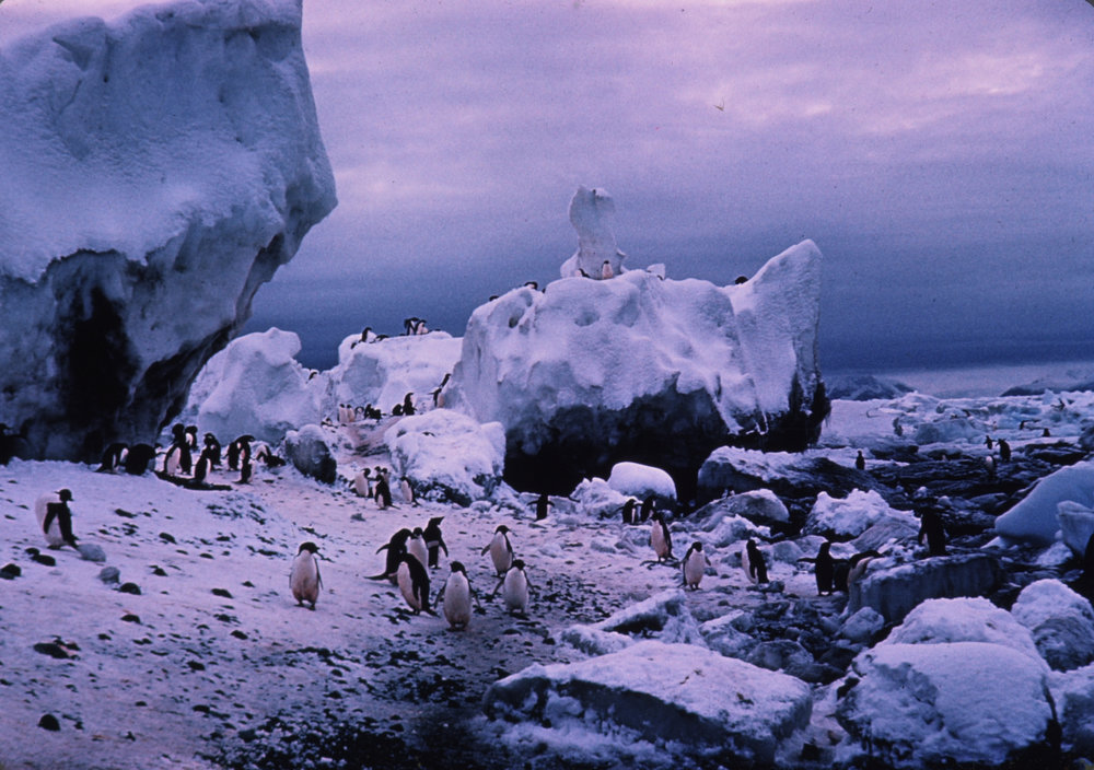 DescriptionAdelie penguin rookery in pressure ice at Cape HallettSeason1961-1962Date Taken1961-1962 SeasonOriginalSlideLocationCape HallettGeolocation[1] Position