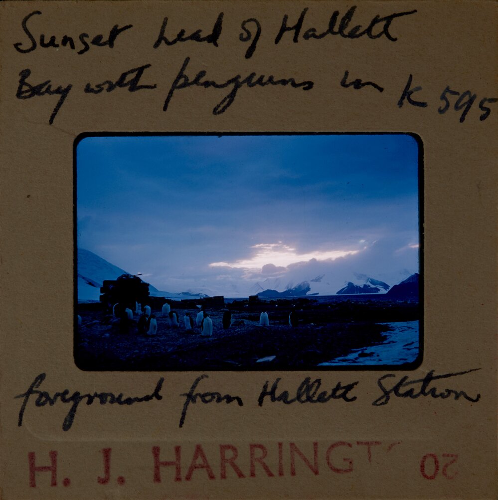 Sunset head of Hallett bay with penguins in foreground from Hallett Station