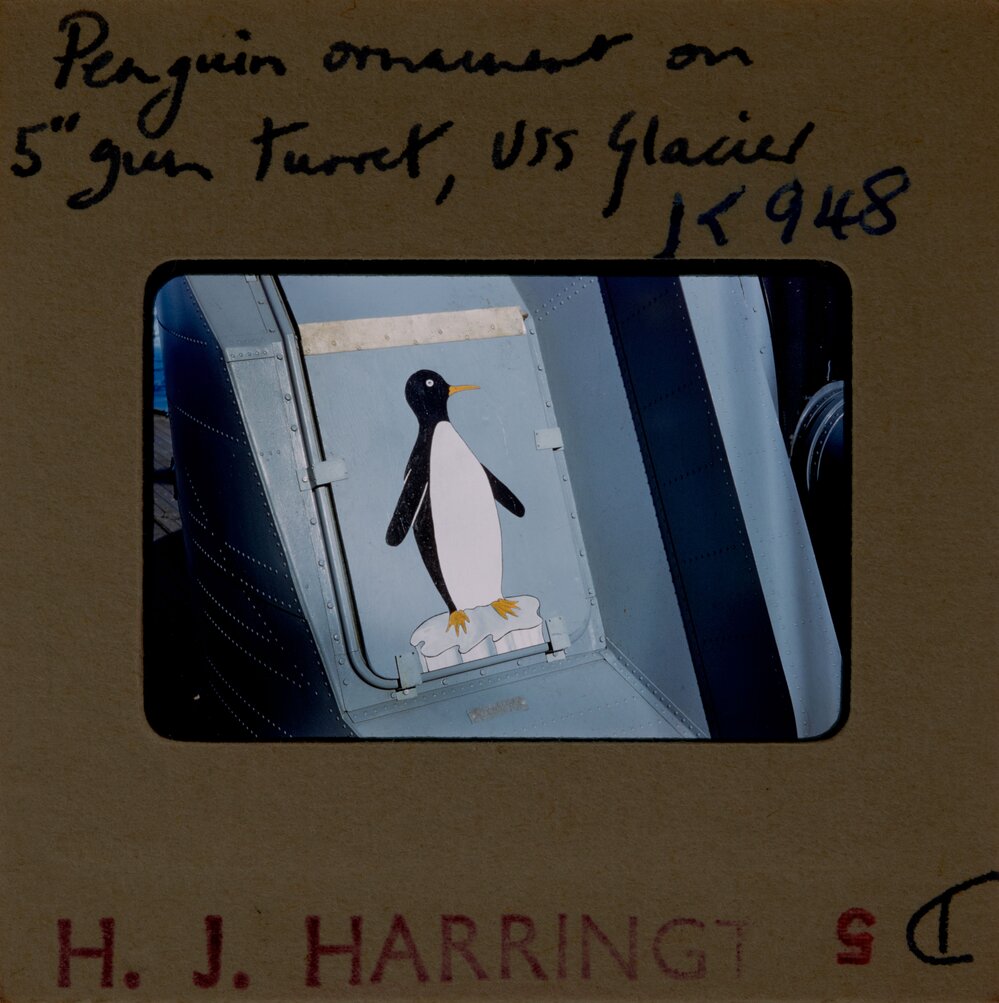 Penguin ornament on 5" gun turret, USS Glacier