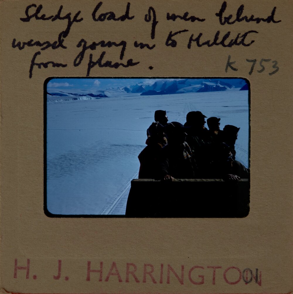 Sledge load of men behind weasel going on to Hallett from plane.