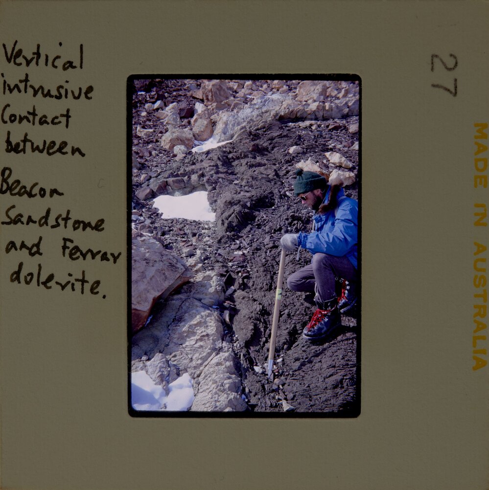 Vertical intrusive contact between Beacon sandstone and Ferrar dolerite
