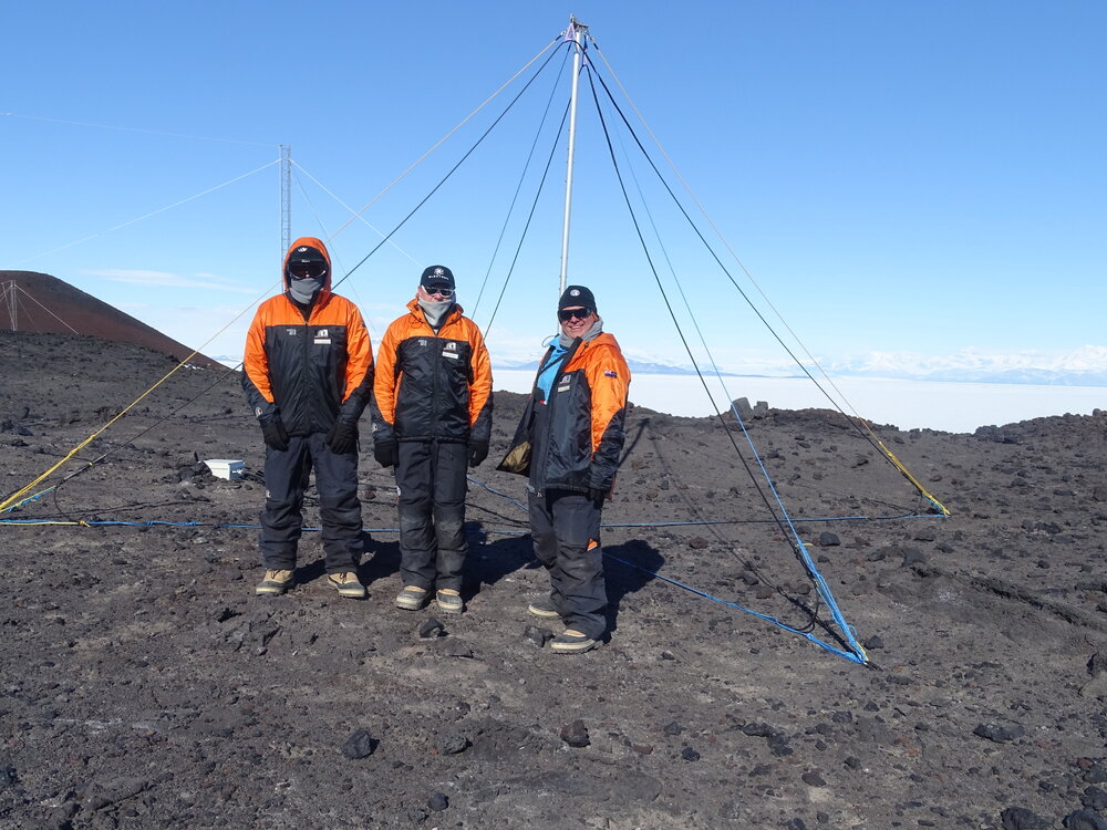 Otago University Space Physics Expedition 13 in front of the original south site VLF magnetic field antenna installed at Arrival Heights in December 2008. From left to right: Daniel Mac Manus, James Brundell, and Craig Rodger.