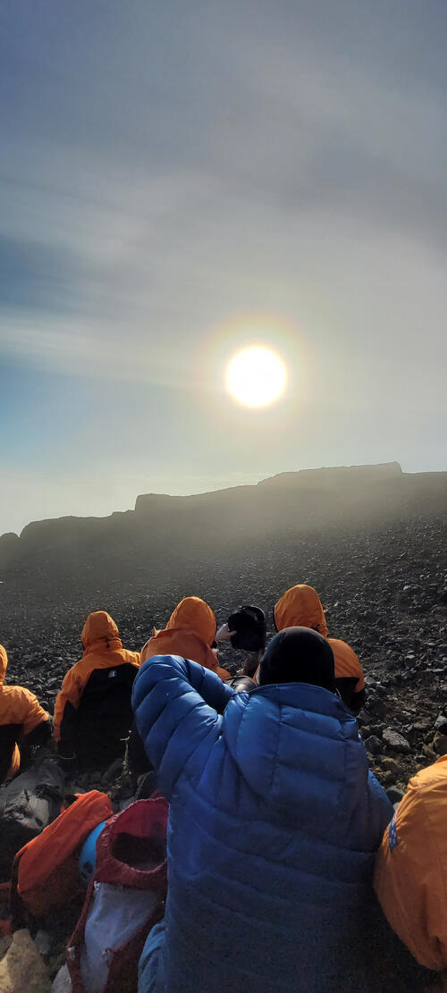 Antarctica New Zealand supported staff and scientific event personelle view a solar eclipse from the top of Castle Rock, near Scott Base.