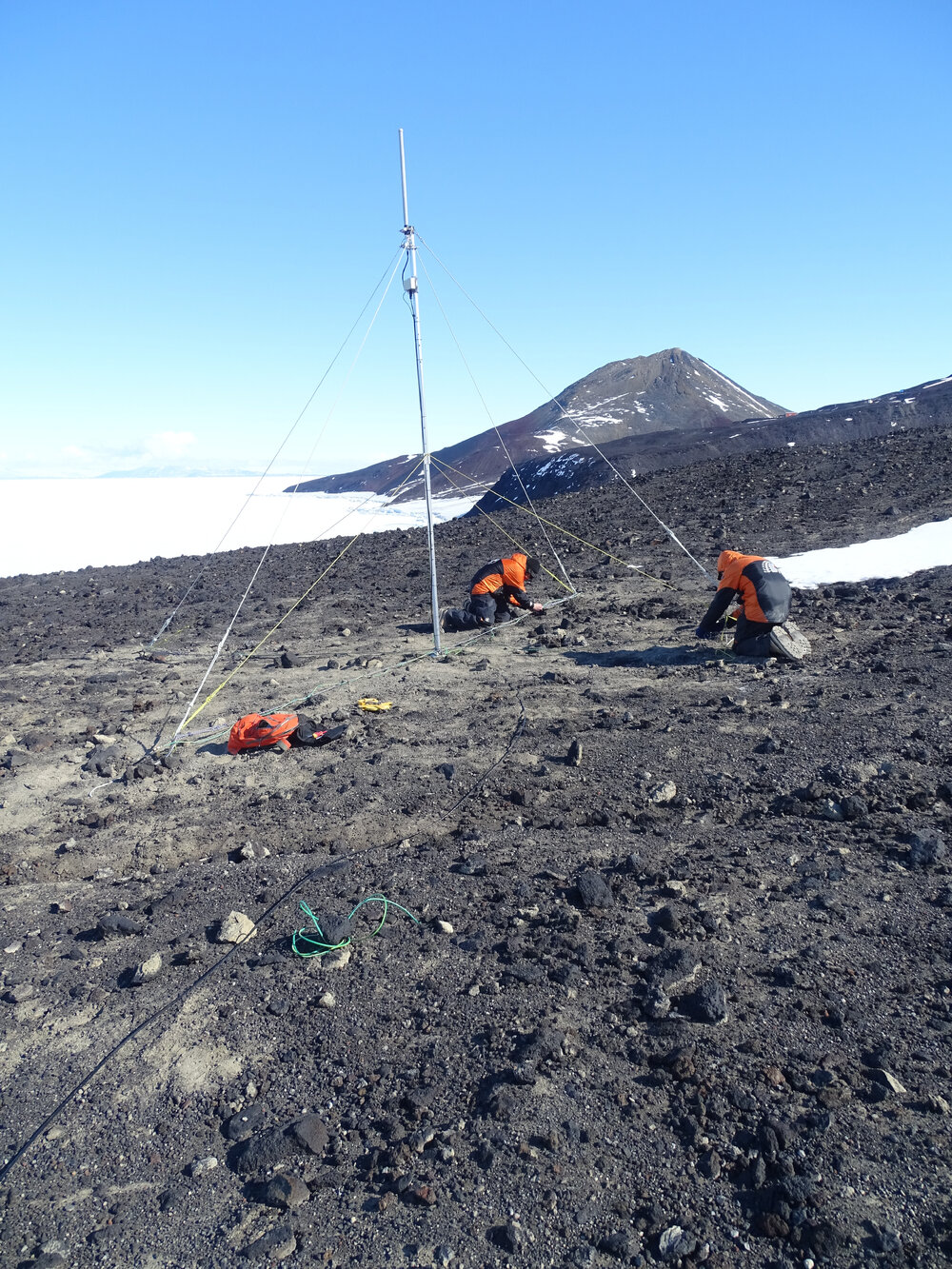 Daniel Mac Manus (left) and James Brundell (right) tidying up the newly shifted VLF electric field antenna location at the back of Scott Base.