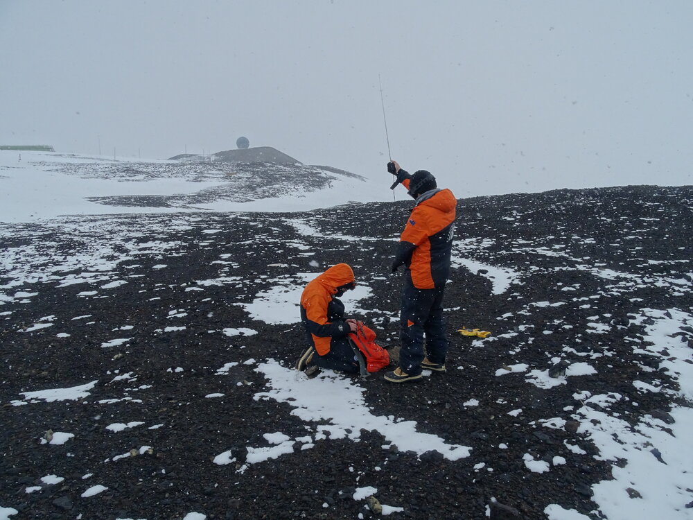 James Brundell (left) and Daniel Mac Manus (right) checking the VLF noise floor using a portable electric field antenna. Note the exposed thumb needed to provide the antenna with an electrical earth (through Daniel).