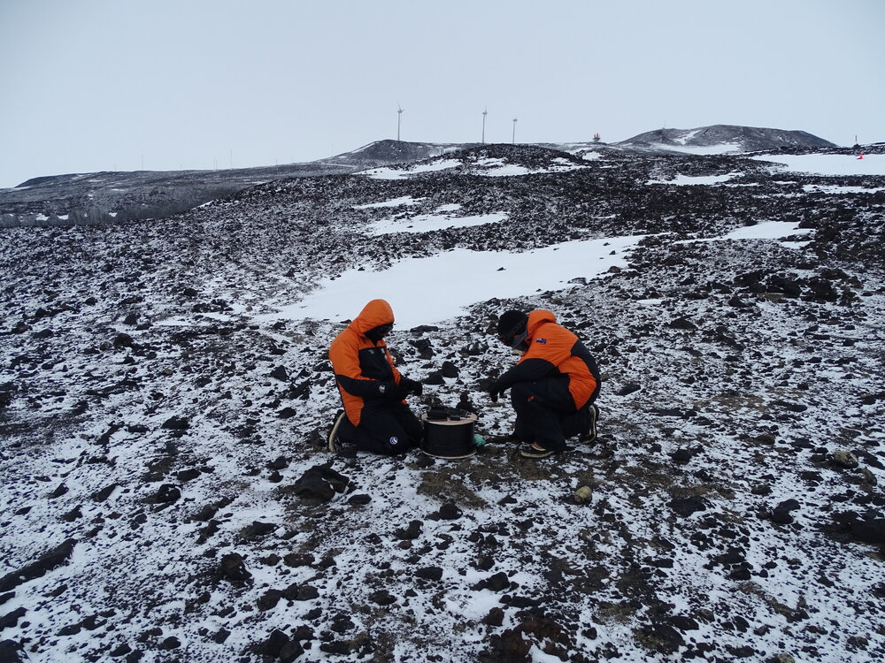 James Brundell (left) and Daniel Mac Manus (right) prepare to make an electric field VLF noise test at the planned location for the shifted K060 electric field antenna. This is near Scott Base.